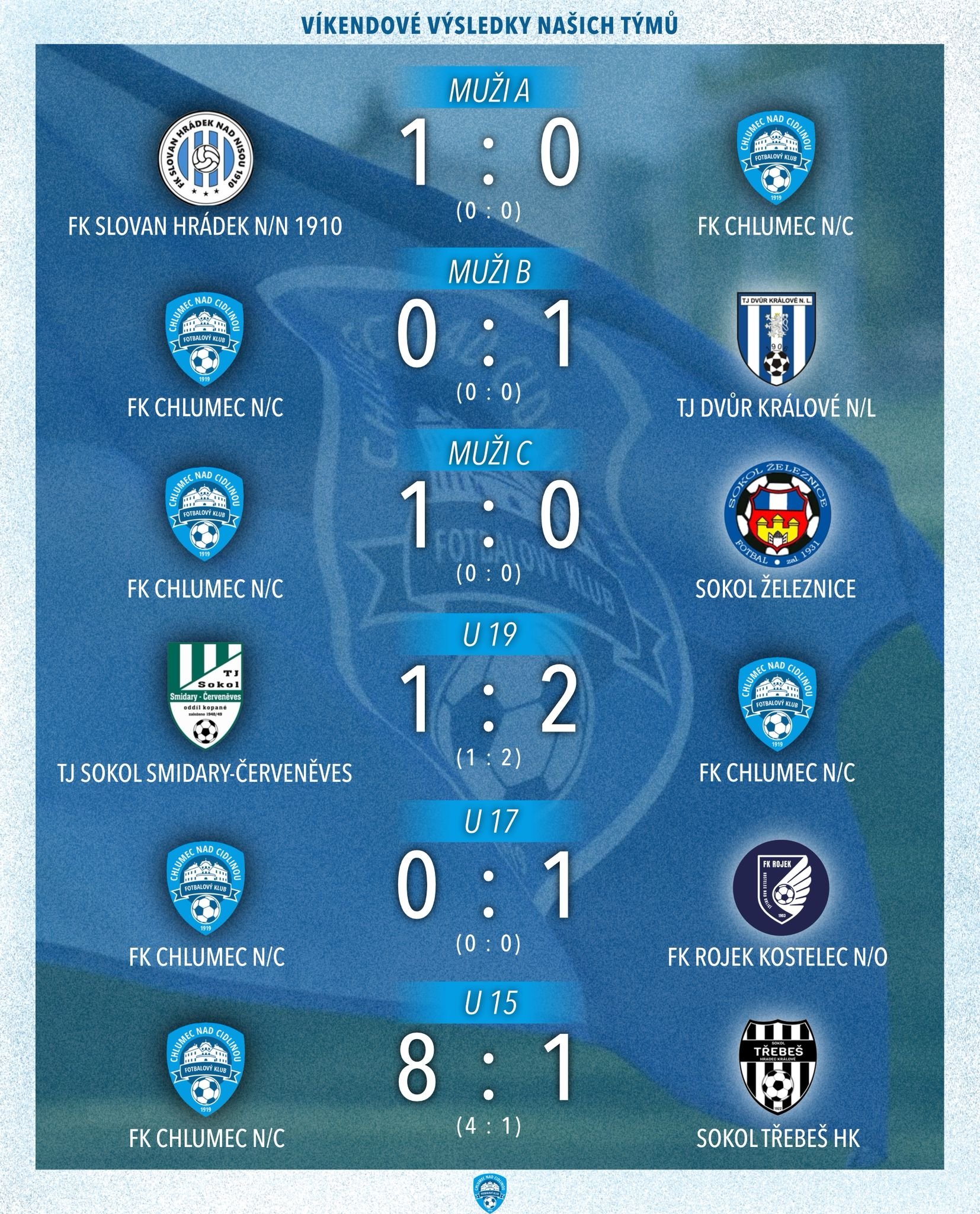 Z mužů bodovalo jen Céčko a byla to pro něj důležitá výhra v boji o záchranu. U19 otáčela zápas v Červeněvsi, U17 v kvalitním utkání inkasovala chvíli před koncem a poprvé na jaře ztratila body. Patnáctka rozstřílela silnou Třebeš. Radost jsme měli i z výkonů mladších kategorií.