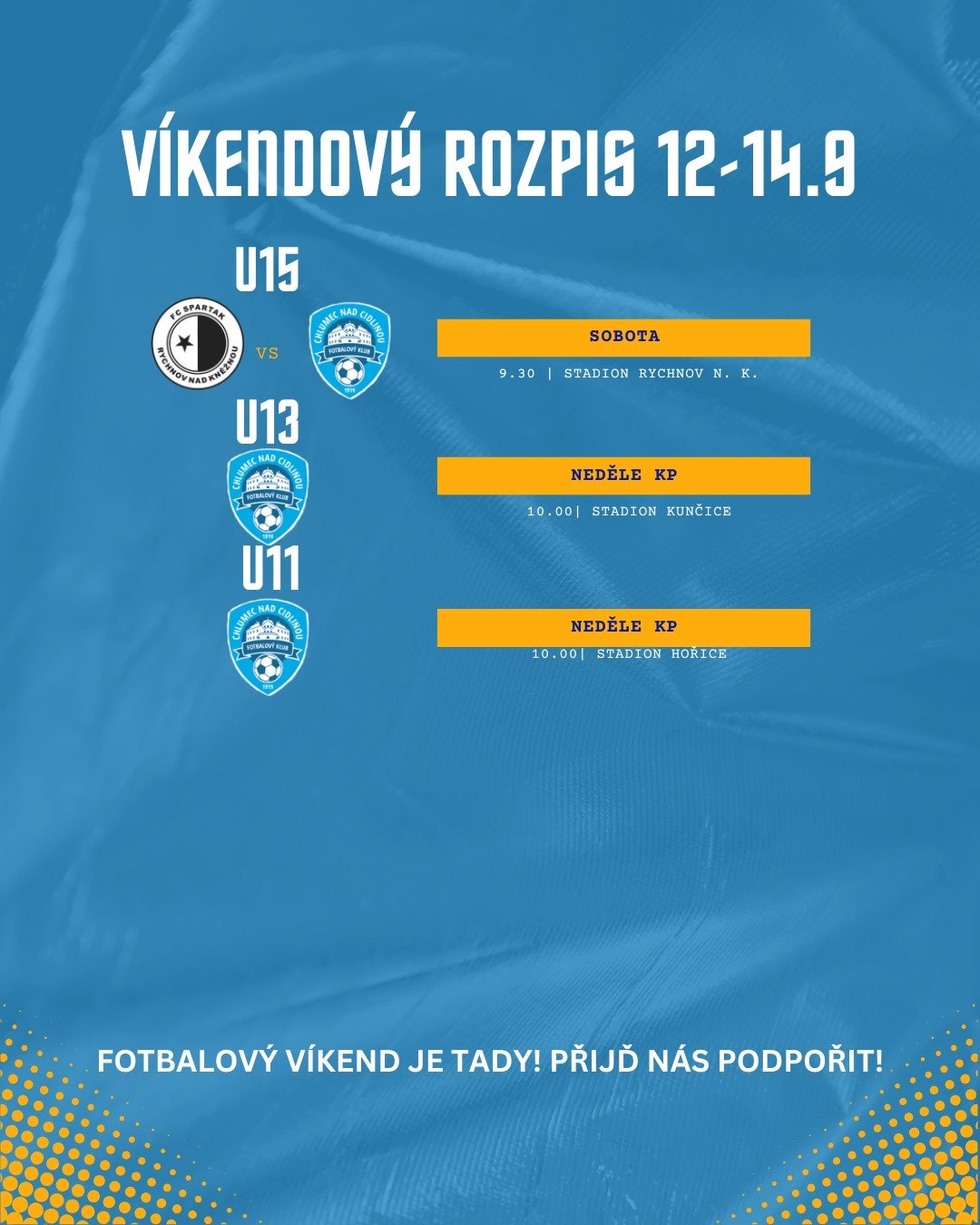 Fotbalový víkend našich týmů začne už v pátek odpoledne v Lovčicích, kde U19 hostí Městec Králové. Áčko hostí v sobotu dopoledne Hrádek nad Nisou, hned po nich hraje U17 s Rychnovem. Ostatní naše týmy se představí na stadionech soupeřů.
