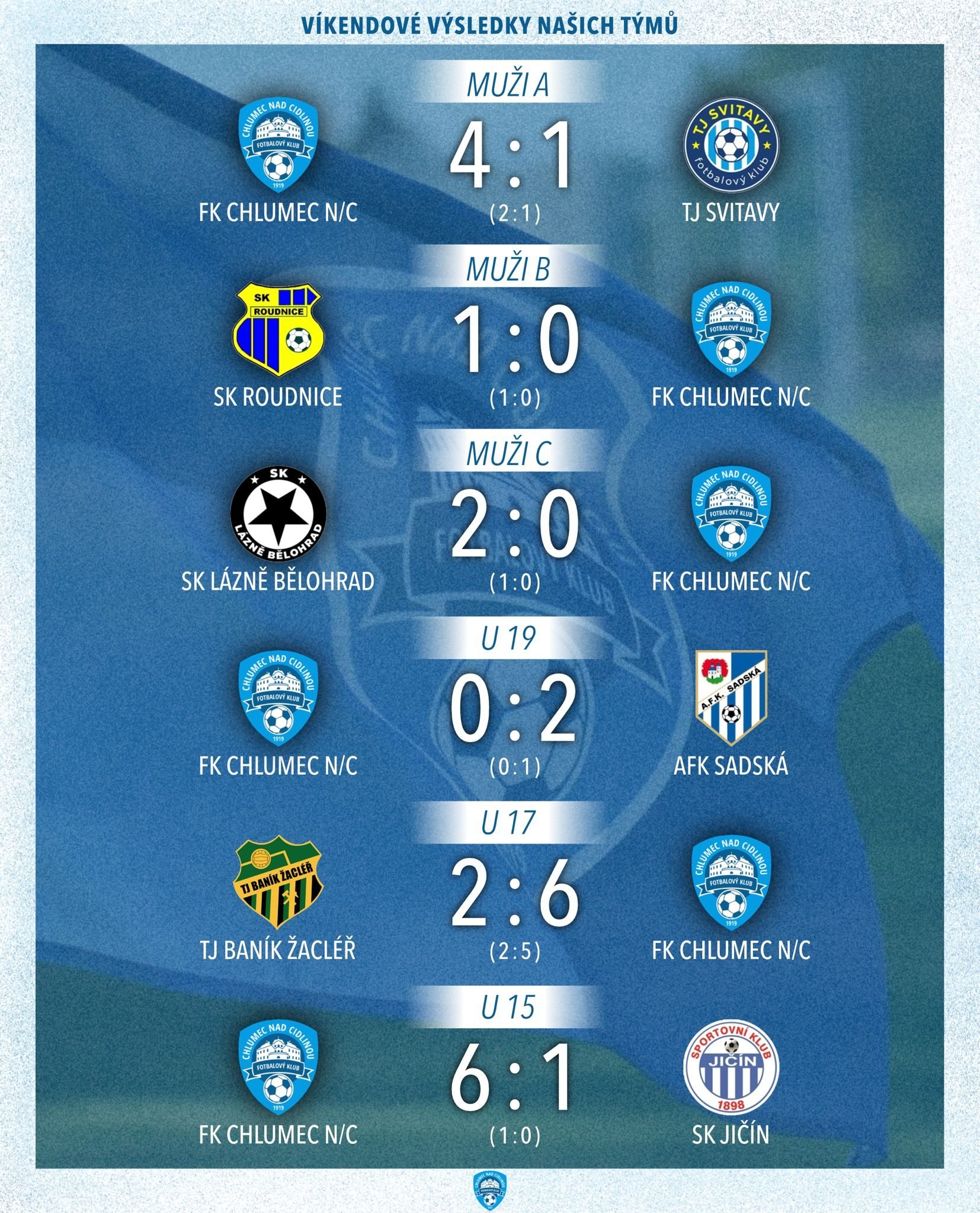 Áčko zvládlo těžký duel v Chrudimi a prodloužilo jarní neporazitelnost. Potěšilo nás také B mužstvo, které přehrálo Solnici a na jaře potřetí vyhrálo. Před těžkou sérií zápasů( Slavia, Dvůr, RMSK), je to pro kluky povzbuzení. Nedařilo se Céčku, které i přes velkou územní převahu, neprolomilo obranný val Nové Paky a prohrálo 0:1 U 19 ve 30. minutě prohrávala v Prasku 0:2, ale poté zápas otočila po brankách Štěpána Volejníka, Petra Beliova, Pepy Jiřičky a Kuby Volejníka na 4:2 ve svůj prospěch. U 17 odehrála v Ředicích velmi dobrou první půli, po které vedla 3:1. O konečný výsledek 4:1 se postarali brankami Pepa Jiřička, Ondra Frajer, Max Husak a Martin Pechr. Také U 15 otáčela svůj zápas s Hořicemi. Výhru 3:2 vystřelili svými brankami David Píša, Pavel Janda a také hosté vlastní brankou.