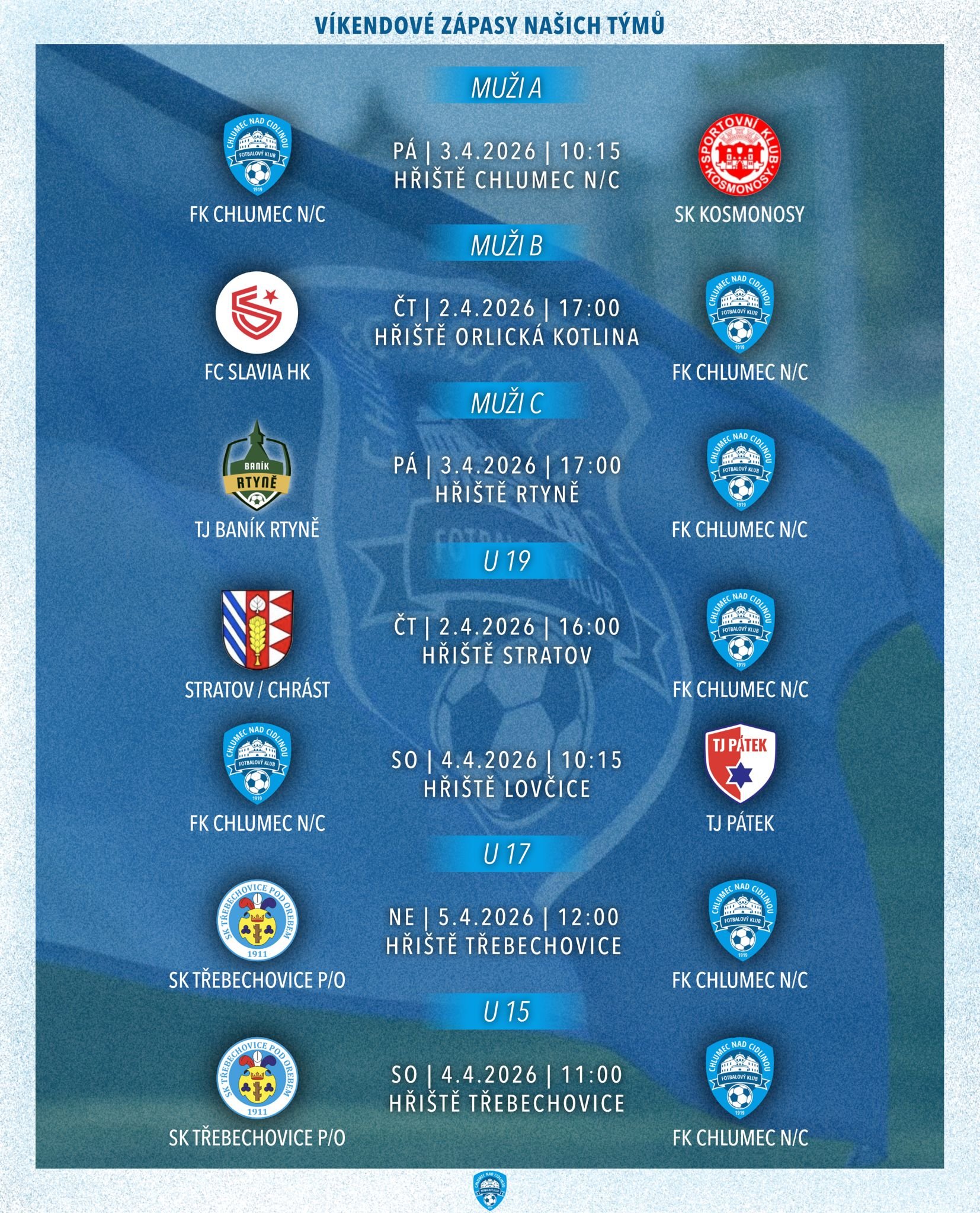 Naše týmy FK Chlumec nad Cidlinou čeká nabitý program! Vše začne už ve čtvrtek kdy hraje B mužstvo na hradecké Slavii a U19 ve Stratově. Na Velký pátek dopoledne se na domácím stadionu představí Áčko proti Kosmonosům. Následují další zápasy až do neděle. Přijďte nás podpořit a vytvořit skvělou atmosféru na hřišti.